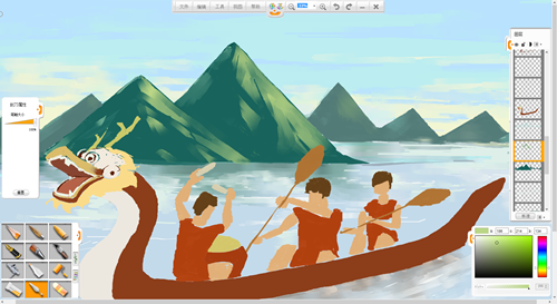 7.用馬克筆筆觸,選擇自己認為適當的顏色,為人物和龍舟涂上顏色。