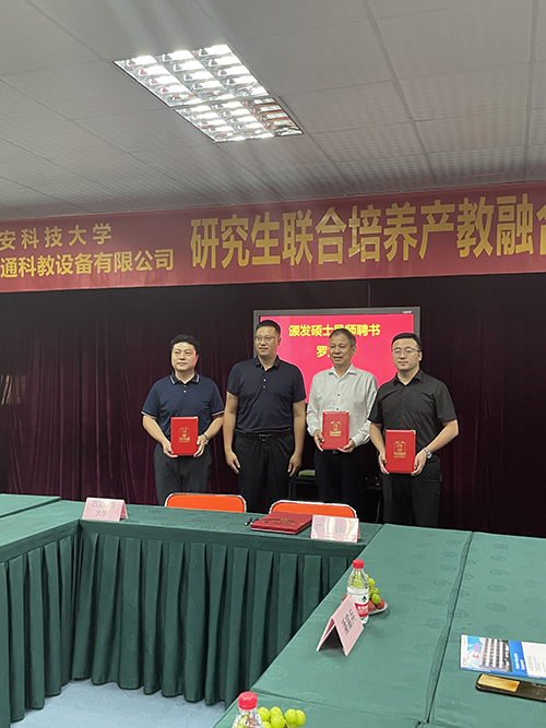 2023年7月8日下午,廣東廣視通科教設備有限公司與西安科技大學“研究生聯合培養產教融合實踐基地”簽約儀式在廣視通大廈二樓會議室舉行。西安科技大學管理學院副院長鄒紹輝,西安科技大學大灣區研究生聯合培養產教融合實踐基地導師羅立升,西安科技大學大灣區MBA校友會籌備組秘書長、東莞市市場監督管理局石排分局同仲強,大灣區西安科技大學MBA校友會籌備組委員陳桂;特邀嘉賓廣東科技學院黨委副書記、副校長畢會東,東莞市名校研究生培育發展中心林洪嘉;公司董事長陳登貴、副總經理吳斌華、副總經理潘富兵等出席簽約儀式。由西安科技大學大灣區研究生聯合培養產教融合實踐基地導師羅立升主持簽約活動。