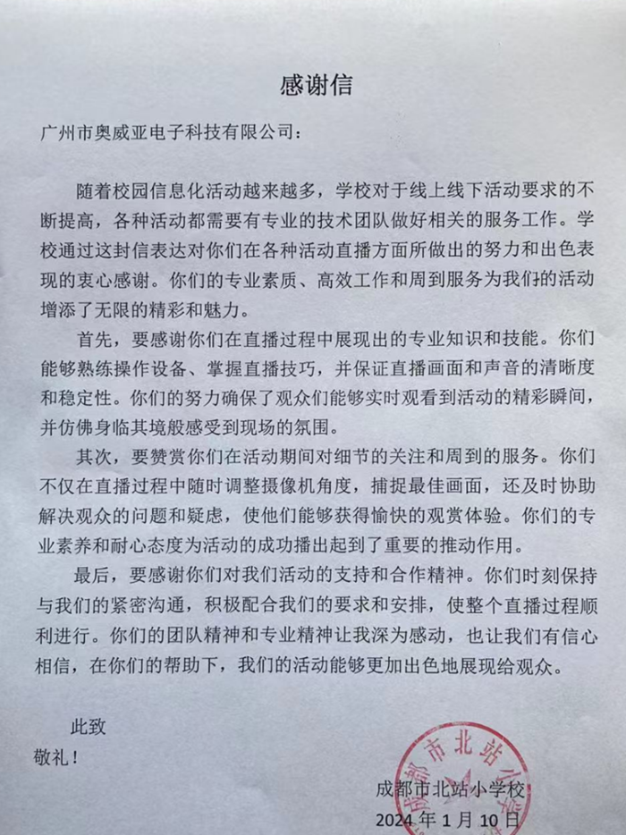 “你們不僅在直播過程中隨時調(diào)整攝像機角度,捕捉最佳畫面,還及時協(xié)助解決觀眾的問題和疑慮,使他們能夠獲得愉快的觀賞體驗。你們的專業(yè)素養(yǎng)和耐心態(tài)度為活動的成功播出起到了重要的推動作用。”