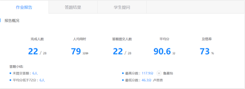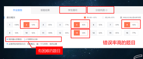 針對全班作答情況的整體反饋,可以打開作業(yè)報告了解作答情況,對于一些錯誤率較高或者耗時較長的困難題目,可以在課堂上進(jìn)行針對性或重點(diǎn)講解。