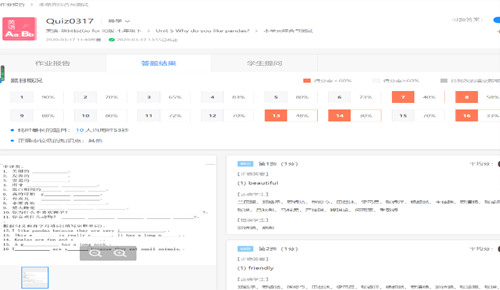 ❖環(huán)節(jié)3:備課成果如何?線上教學(xué)的效果如何?通過一次階段性檢測便可以摸清學(xué)生的情況。英語學(xué)科有大量的客觀題,希沃易課堂的客觀題自動批改可以迅速獲取答題結(jié)果。學(xué)校在此基礎(chǔ)上做年級質(zhì)量分析,也為備課內(nèi)容做出了方向指導(dǎo),實(shí)現(xiàn)備課閉環(huán)。