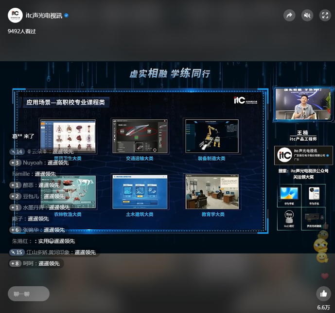 6月12日下午,一場(chǎng)主題為“虛實(shí)相融 學(xué)練同行”的行業(yè)公開課在【itc聲光電視訊】直播間成功舉辦!這場(chǎng)公開課聚焦itc虛擬仿真教室解決方案,旨在引領(lǐng)觀眾深入探討其在教育領(lǐng)域的創(chuàng)新應(yīng)用與未來(lái)發(fā)展。此次活動(dòng)得到多個(gè)協(xié)會(huì)的支持,慧聰教育、演藝設(shè)備協(xié)會(huì)及數(shù)字音視工程網(wǎng)等協(xié)會(huì)平臺(tái)進(jìn)行同步直播。