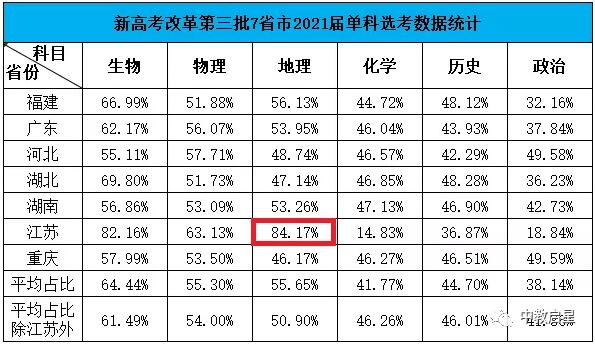實(shí)行新高考改革方案的部分省市2021屆學(xué)生各科選考數(shù)據(jù),其中江蘇省最受歡迎的科目是地理,并且占比超過(guò)80%。