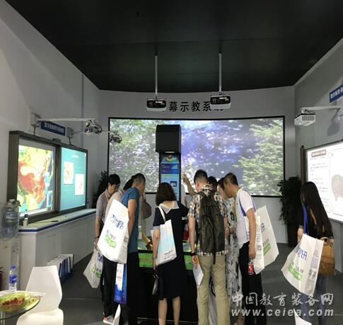 在人潮涌動的羿飛教育展區,巨大的環幕示教系統尤為矚目。相比普通投影系統,羿飛環幕示教系統具備更大的顯示尺寸、更寬的視野、更多的顯示內容、更高的顯示分辨率,以及更具沖擊力和沉浸感的視覺效果。運用曲面投影顯示形式,播放宇宙與地球、地質災害等視頻資料,以及課外科普影片,激發學生的學習興趣,幫助教師將課程順暢地導入到本堂課的教學任務中。