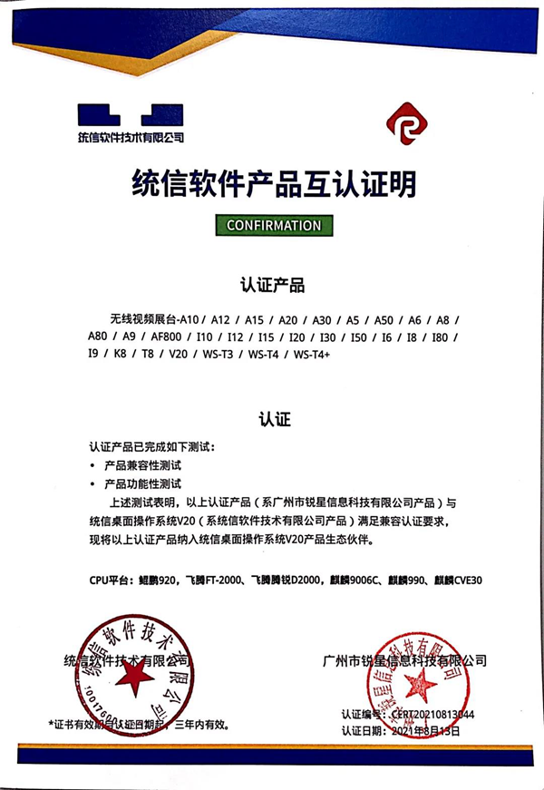 統信認證證書(展示互動寶、無線微錄儀)