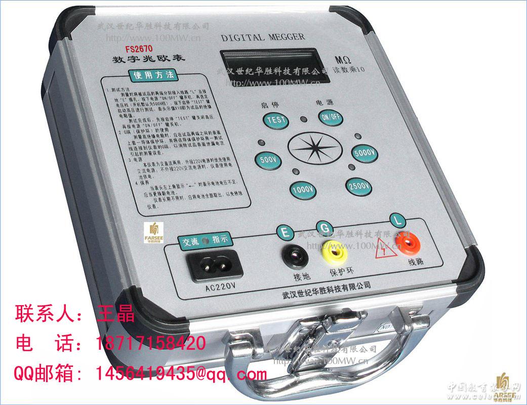 產品詳細介紹◆ 概述 華勝FS2670系列高壓兆歐表(或稱高壓絕緣表)符合國家新頒布電力行業(yè)標準《電子式絕緣電阻表DL/T845.1-2004》的規(guī)范,能滿足各種電氣設備絕緣電阻測試的要求。儀表內置長效充電電池,操作方便性和安全性明顯優(yōu)于傳統(tǒng)機械搖表0~20G。
