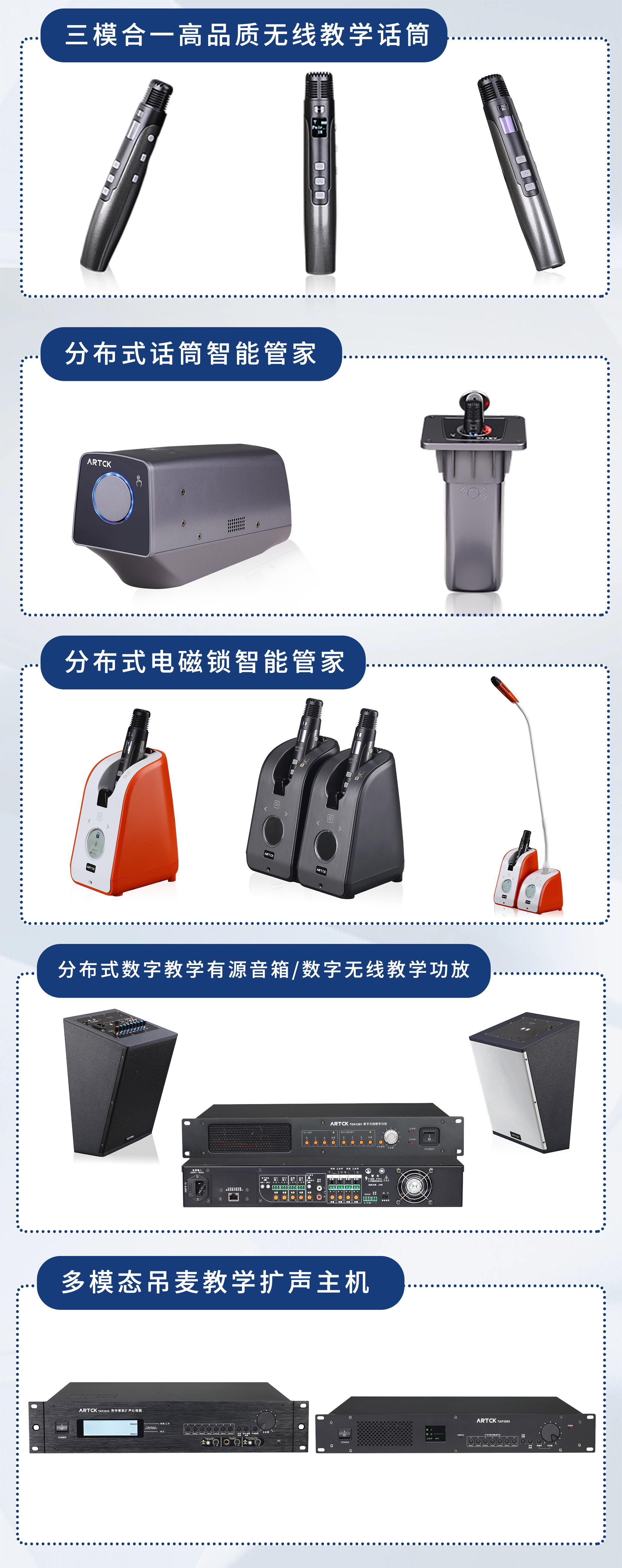 錄播音頻采集與處理全功能系統、2.4G無線教學音箱、2.4G無線話筒、2.4G三合一無線話筒、無線麥克風、無線教學有源音箱、反饋抑制器、混音器、效果器、錄播吊麥、會議系統、無線會議話筒、電容式會議話筒、會議系統