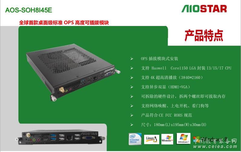 Aiostar OPS 全稱為:Aiostar Open Pluggable Specification,開放式可插拔規(guī)范。是Intel與顯示器廠商共同制定的標準化數(shù)字標牌接口規(guī)范。OPS內部組成是一個X86架構的迷你PC,采用英特爾酷睿處理器,配有內存、硬盤、多種輸入輸出接口以及Windows操作界面,尺寸為200mm x 119mm x 30mm 。 以下為Intel 官網(wǎng)對于OPS的定義: 原文如下: Digital Signage Open Pluggable Specification :Simplify digital signage development Highlights Enables easier installation, use and maintenance of digital signs. Makes digital signage devices more intelligent and connected. Overview The open pluggable specification (OPS) helps standardize the design and development of digital signage devices and pluggable media players. Intel created OPS to address digital signage market fragmentation and simplify device installation, usage, maintenance and upgrades. OPS enables digital signage manufacturers to deploy interchangeable systems faster and in higher volumes, while lowering costs for development and implementation. Installing digital signage equipment based on Intel architecture helps you implement scalable digital signage applications that can network easily with other equipment. This simplifies interoperability and application upgrades designed to meet the digital signage requirements of individual customers, while helping to future-proof technology investments.[1] 譯文: 強調 更便于安裝、使用和維護的數(shù)字信號。 使數(shù)字看板設備更智能和融合。 概述 開放的可插拔的規(guī)范(OPS)有助于規(guī)范的設計和開發(fā)數(shù)字看板設備,并插入媒體播放器終端。Intel創(chuàng)造OPS 致力于數(shù)字看板市場分化和簡化設備安裝、使用、維護和升級。 OPS可以使數(shù)字看板制造商更快部署大量的交互系統(tǒng),同時降低開發(fā)和實現(xiàn)的成本。 安裝基于英特爾架構的數(shù)字標牌設備可以幫助您實現(xiàn)可伸縮的數(shù)字看板應用程序,并且很容易和其他設備進行網(wǎng)絡連接。這簡化了通過交互和升級的設計來滿足個人客戶的數(shù)字看板需求,同時有利于面向未來的技術投資。 2特點編輯 1、支持數(shù)字標牌等行業(yè)最新的OPS規(guī)范的電腦模塊,加速數(shù)字標牌行業(yè)的標準化趨勢。 2、OPS模塊可以簡化設備的安裝、使用、維護和更新,幫助數(shù)字標牌制造商降低開發(fā)和實施成本。 3、OPS可簡便地與其它設備聯(lián)網(wǎng),可擴展數(shù)字標牌應用,滿足數(shù)字標牌對交互和應用更新的需求。 4、部分OPS平臺支持遠程管理及低功耗模式,解決耗電及散熱要求。同時平臺所支持的Intel vPro、AMT遠程管理技術,實現(xiàn)設備無人操控下的高效運作。如采用四代i5+Q87平臺的AOS-SOQ8I45A 5、OPS無風扇散熱設計,提供超靜音的解決方案,保證工作環(huán)境的安靜、清爽。發(fā)熱量小也帶來了較小的功耗。 3整機編輯 Intel 2011年提出該規(guī)范后,伴隨著日本NEC OPS接口顯示器的上市,傳統(tǒng)數(shù)字標牌嵌入式主板走下神壇,OPS模塊化正式開啟。代表作品有 愛鑫微電子(AIOSTAR) AOS-SOH8I45A ,
