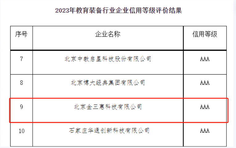 北京金三惠科技有限公司經(jīng)嚴(yán)格評(píng)審,獲得2023年中國(guó)教育裝備行業(yè)AAA企業(yè)信用等級(jí)證書(shū)。