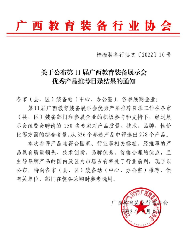 關于公布第11屆廣西教育裝備展示會優秀產品推薦目錄評選結果的通知