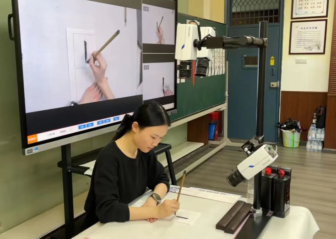在活動現(xiàn)場,授課教師何悅利用華文眾合智慧書法教室為學生們上了一節(jié)別開生面的書法課”。通過直播授課把“懸針豎”的起筆、行筆、運筆、收筆從三個角度進行展示,并同步到每個學生端;通過互動系統(tǒng)更清晰快速地指導學生的書法練習細節(jié);通過邊看邊練讓學生的書法臨摹變得更高效。應用華文眾合智慧書法教室的各項功能,很好地展示了書法教學細節(jié),提升了書法教學質(zhì)量。