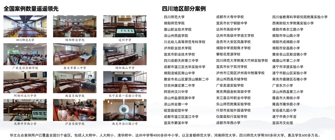 “雙減”之下,學(xué)校和社會(huì)都要為學(xué)生的全面發(fā)展撐起一片天。書法教育作為素質(zhì)教育里的賽道之一,自然成為學(xué)校發(fā)展優(yōu)質(zhì)課后服務(wù)的焦點(diǎn)。華文眾合智慧書法教室使傳統(tǒng)與科技相結(jié)合,既注重技術(shù)的先進(jìn)性,又注重教學(xué)的先進(jìn)性。也正是因?yàn)檫@些理念,讓華文眾合的產(chǎn)品在此次四川教育博覽會(huì)上大放異彩,獲得廣大校長(zhǎng)、老師等教育界人士的一致好評(píng)和認(rèn)可。目前,華文眾合的智慧書法教室已經(jīng)覆蓋全國32個(gè)省市及自治區(qū),有4000多所中小學(xué)案例、300多所高校案例,其中包括清華大學(xué)附屬中學(xué)、中國人民大學(xué)附屬中學(xué)、中國人民大學(xué)附屬小學(xué)、首都師范大學(xué)等名校,惠及學(xué)生600多萬名。