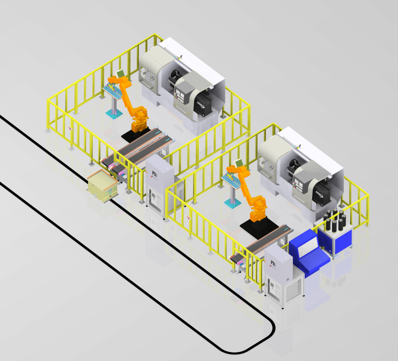本設(shè)備包含機(jī)器人本體、自動(dòng)上料裝置、下料輸送裝置、車床改造一臺(tái)。人工將毛坯件放入到上料機(jī)自動(dòng)上料,機(jī)器人從上料機(jī)上取料,對(duì)兩臺(tái)機(jī)床進(jìn)行自動(dòng)上下料工作,車床自動(dòng)關(guān)門加工,加工完成由機(jī)械手將成品取出,放置到皮帶線上進(jìn)行輸送。