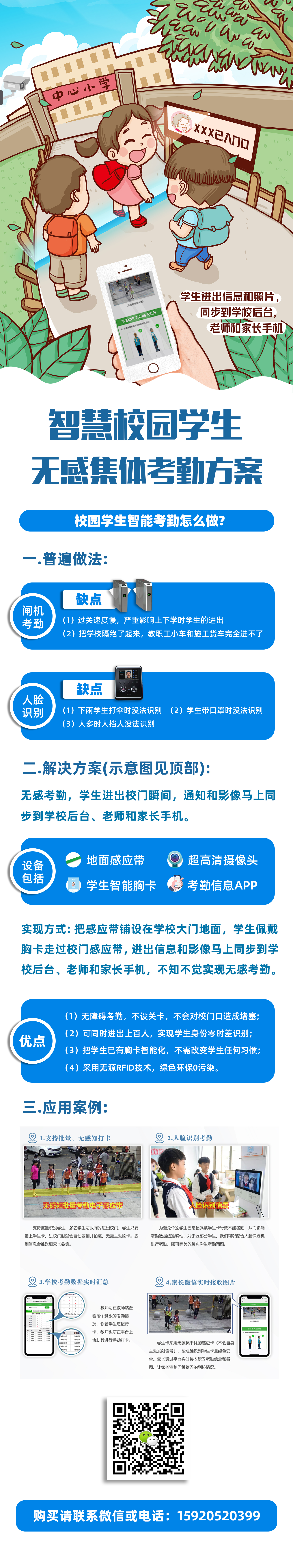 產品詳細介紹實現方式: 把感應帶鋪設在學校(工廠)大門地面,學生(員工)佩戴胸卡走過校門感應帶,進出信息和影像馬上同步到老師和家長(工廠組長和后勤)手機,不知不覺實現無感考勤。
