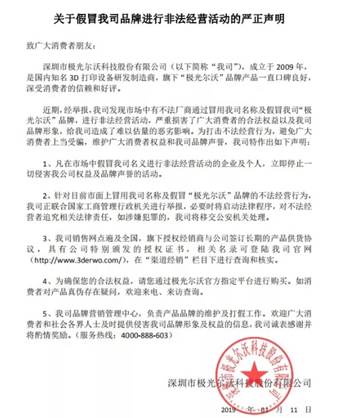3D打印機出現冒牌貨,極光爾沃發表嚴正聲明