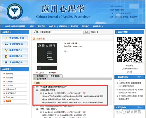 我司第一作者論文《學習績效與教室照明環境研究述評》,刊登在《應用心理學》2018年第24卷第4期,291-303。