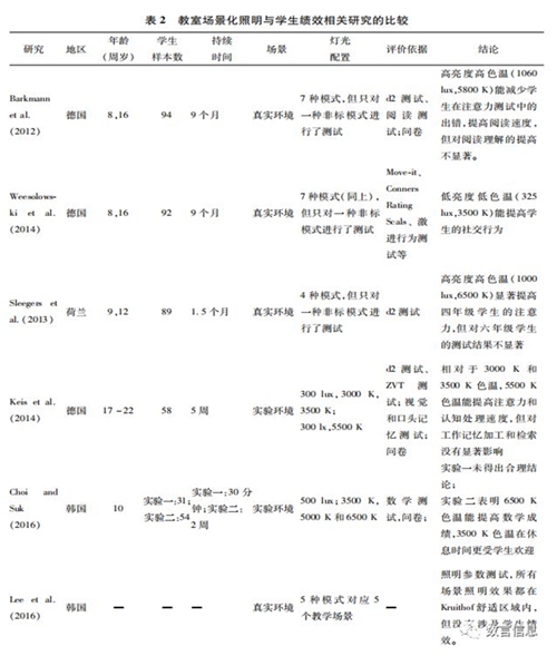 論文中也提到:近期也有學者開始關注在不同教學場下,照明配置方案對學生學習績效的影響。雖然這些研究對教學場景的定義不同(如:簡單、標準和高負荷,或者數學、藝術、社交、休息),但是其目標是一致的,就是尋找與教學內容和教學目標相匹配的最優照明配置方案。因此,論文特別針對這個方向有代表性的研究進行了概括。