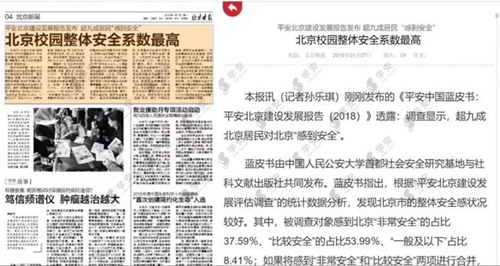 在《平安中國藍(lán)皮書:平安北京建設(shè)發(fā)展報(bào)告(2018)》中曾指出,北京校園整體安全系數(shù)為較高。報(bào)告中稱,按照不同類型校園安全狀況由高到低排名依次是幼兒園、中小學(xué)校園、大學(xué)校園。幼兒園整體安全狀況最好,在被調(diào)查對(duì)象中,有11.79%的被調(diào)查者認(rèn)為幼兒園存在食品安全問題,其他安全問題尚不顯著。