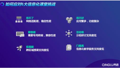 青鹿總結(jié),“用不了、用不好、兼容差、互動難、實(shí)現(xiàn)弱、門檻高”成為當(dāng)前課堂實(shí)踐中的6大痛點(diǎn)。