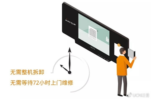黑板固件出現故障時, E-box專利設計將視頻卡、OPS等易損部件全部集成到一個小盒子里。只要從右側直接拉出來更換備份Box,不需要彎腰或者爬凳的復雜操作,更不需要整機拆卸,即便是女老師也能輕輕松松完成,30min內解決問題。如果是其他問題,泛普的技術服務團隊將在4小時內抵達現場。這時,維修人員通過將黑板往上翻轉即可進行故障的排查,不用像以前一樣將整塊黑板從墻上拆下來,大大縮短了維修時間。