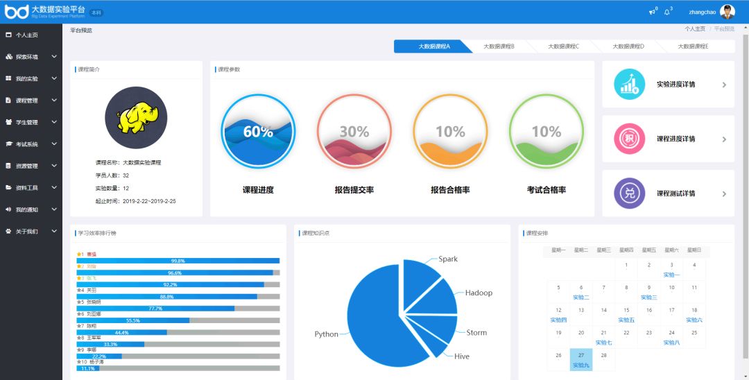 云創大數據實驗平臺與人工智能實驗平臺采用Docker容器技術,通過少量機器虛擬出大量的實驗機器,可供學生同時擁有多套集群進行基礎實驗。