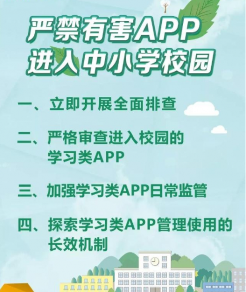 為營造良好的“互聯網+教育”育人環境,保障中小學生健康成長,教育部辦公廳在2019年1月2日印發了《關于嚴禁有害APP進入中小學校園的通知》,要求各地采取有效措施,堅決防止有害APP進入中小學校園。通知指出,各地教育行政部門和中小學校要建立健全日常監管制度,明確監管責任和辦法,切實保障進入校園的APP安全健康、科學適宜。強調要開展全面排查,凡發現包含色情暴力、網絡游戲、商業廣告及違背教育教學規律等內容的APP要立即停止使用,要將涉嫌違法違規的APP、微信公眾號報告當地網絡信息管理和公安部門查處,要采用多種方式提醒家長慎重安裝使用面向中小學生的APP。