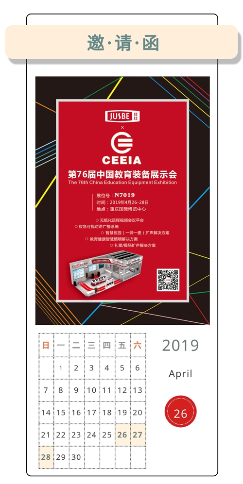 由中國(guó)教育裝備行業(yè)協(xié)會(huì)主辦,重慶市教育委員會(huì)、重慶市商務(wù)委員會(huì)承辦的第76屆中國(guó)教育裝備展示會(huì),將于2019年4月26日至28日在重慶國(guó)際博覽中心隆重舉行。展會(huì)以“展示、交流、合作、發(fā)展”為主題,全面展示各級(jí)各類學(xué)校教育裝備的新產(chǎn)品、新技術(shù)、新成果。在此,佳比誠(chéng)邀廣大新老客戶親臨現(xiàn)場(chǎng)參觀、體驗(yàn)!