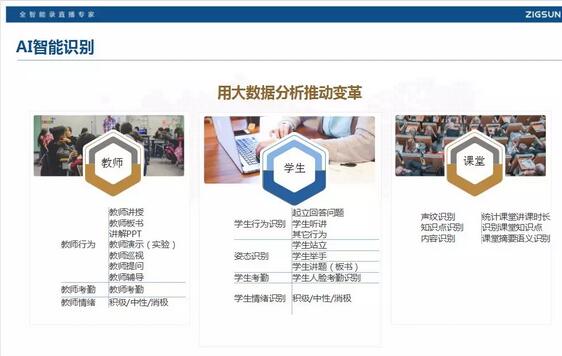 AI課堂利用精品、4K、常態(tài)等錄播系統(tǒng)作為基礎(chǔ)視頻采集源,進(jìn)行人臉識(shí)別、表情識(shí)別、行為識(shí)別、姿態(tài)識(shí)別、知識(shí)點(diǎn)識(shí)別等多項(xiàng)識(shí)別內(nèi)容,并對(duì)課堂數(shù)據(jù)進(jìn)行統(tǒng)計(jì)分析,生成課堂分析報(bào)告,幫助教師進(jìn)行教學(xué)反思,提供課堂教學(xué)改善建議。