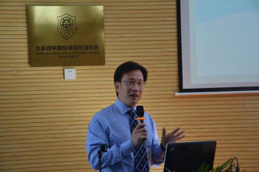 圖為2018年9月份北京四中馬景林校長在北京四中國際課程佳蓮校區開學典禮上講話