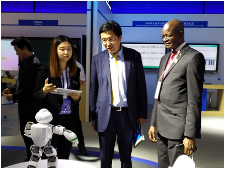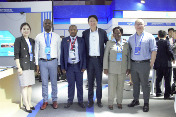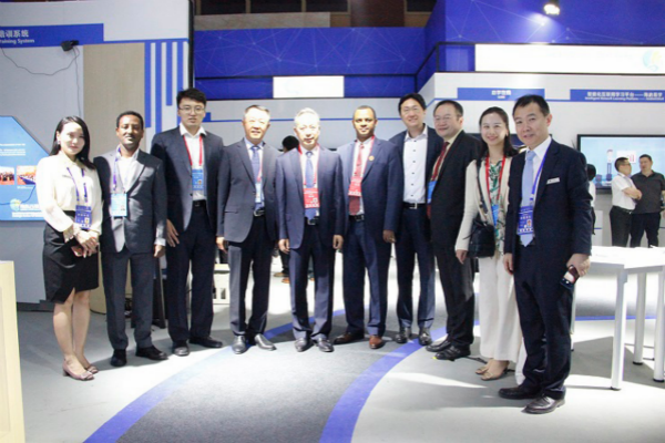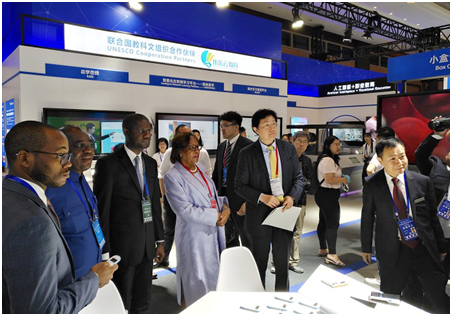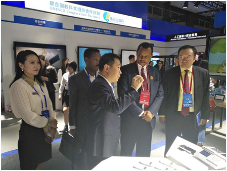 圖:埃塞俄比亞教育部部長一行及聯合國教科文組織領導參觀偉東云教育展區并合影