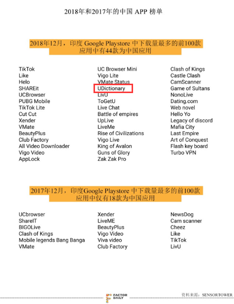 眾所周知,近年來印度市場(chǎng)已成為中國(guó)App紛紛選擇出海的第一站。截至2018年年底, 印度Google Play Store移動(dòng)應(yīng)用Top 100(涵蓋不同分類)的App中,中國(guó)App就占了44個(gè),U-Dictionary便是其中一款。在登陸印度市場(chǎng)僅數(shù)月內(nèi),U-Dictionary即在“Best Self-Improvement”細(xì)分榜單中名列第一,超過了在全球備受歡迎的TED與語言學(xué)習(xí)工具Duolingo(多鄰國(guó)),同時(shí)也領(lǐng)先印度本土的學(xué)習(xí)App:BYJU'S。