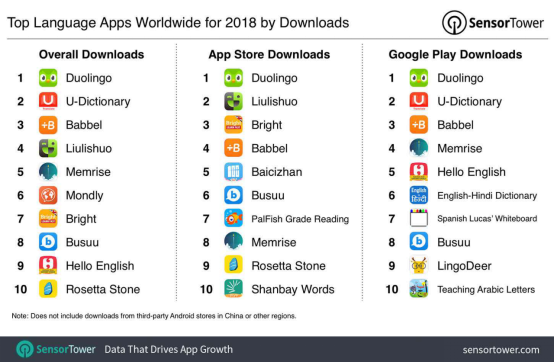 另外,SensorTower數(shù)據(jù)還顯示,2018年全球語言類App下載量榜單排名,U-Dictionary在下載量總榜與Google Play下載量排行榜上均排名第二,僅次于老牌產(chǎn)品Duolingo。