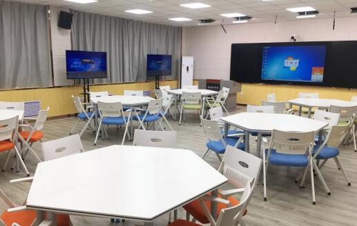 六邊形拼接式桌子與互動式的投屏,打造出便捷自由的教學氛圍,讓學生從被動化主動,可以相互之間進行學習組討論和提問。參與感,是洛陽理工學院師生對于智慧錄播教室最大的感觸。