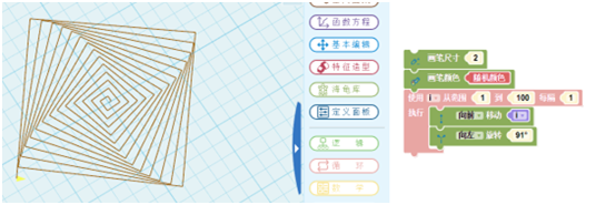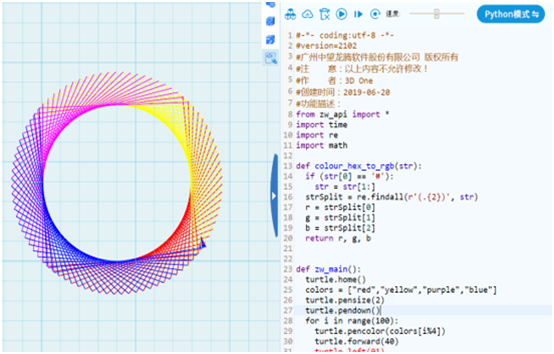 3D One軟件積木模式下,只需通過海龜庫控制畫筆的移動,并結(jié)合數(shù)學(xué)知識,簡單幾步操作,就能繪制出形狀和顏色都鮮艷豐富的圖案,單擊切換Python模式還可了解圖案代碼,為少兒入門學(xué)習(xí)Python提供更加輕松樂趣的途徑。