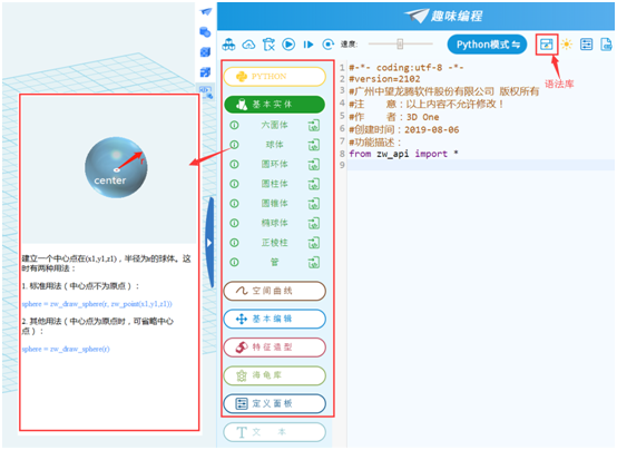 3D One軟件語法面板庫里集合了Python編程所有涉及到的語法語句、建模API、海龜庫命令等,并支持對插入的語句在線進(jìn)行指引,幫助掌握代碼意思和用法。