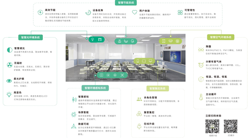 數(shù)言智慧環(huán)境教室解決方案將物聯(lián)網(wǎng)技術(shù)應(yīng)用到教室環(huán)境中,該解決方案由五個(gè)部分組成:智慧光環(huán)境系統(tǒng)、智慧環(huán)境感知系統(tǒng)、智慧集控系統(tǒng)、智慧空氣環(huán)境系統(tǒng)、智慧節(jié)能系統(tǒng)。同通過對聲學(xué)環(huán)境、光環(huán)境、空氣質(zhì)量(PM2.5、CO2、甲醛、TVOC、PM10等)、溫度、濕度等的實(shí)時(shí)監(jiān)測和調(diào)節(jié),一方面確保教室環(huán)境滿足國家相關(guān)標(biāo)準(zhǔn),另一方面為廣大師生營造一個(gè)健康、節(jié)能、高效、可管理的學(xué)習(xí)環(huán)境。