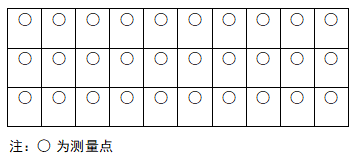 黑板燈的品質和安裝方式都會影響到黑板的照度均勻度,因此,需要實地測試才能確定是否合格。相關國標對黑板照度均勻度的測量方法有明確規定。以規格4 m× 1.2 m的黑板為例,劃分為0.4 m×0.4 m大小的單元格,共10×3=30個,取單元格的中心位置為測量點,下圖所示: