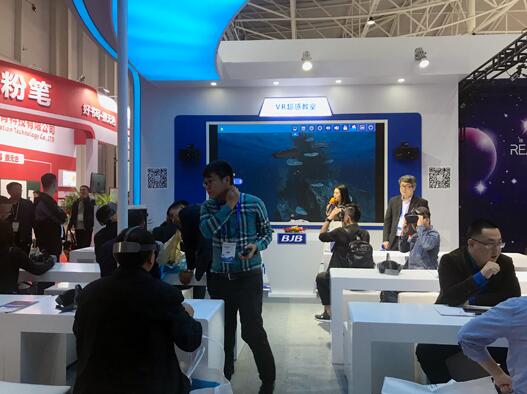 圖二:第77屆中國教育裝備展上威爾文教展示VR超感教室吸引參觀體驗觀眾