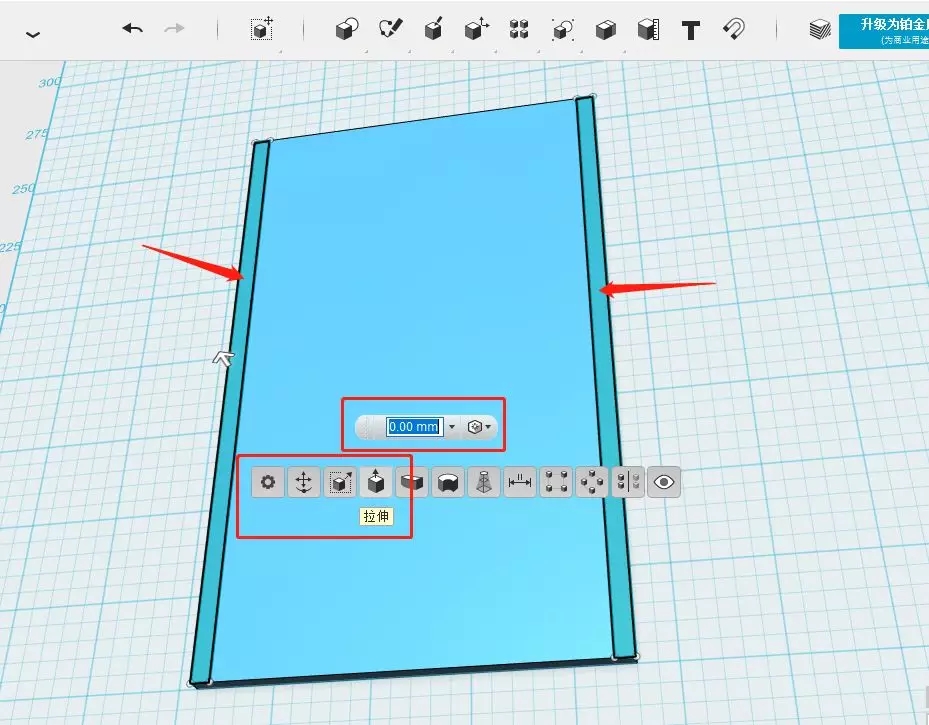 第二步:繪制支架,選擇上視圖,點擊矩形命令,在長方體表面繪制如圖所示的兩個矩形,尺寸:長118mm,寬5mm,即一個單元格。然后按住Ctrl,依次選中兩個矩形,點擊拉伸,拉伸高度160mm。