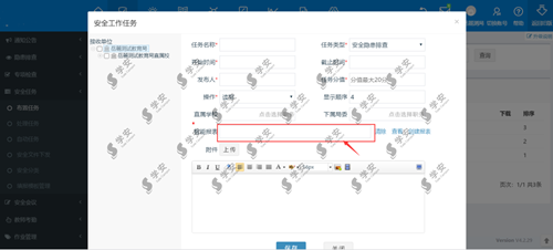 登錄學安智慧校園安全防范平臺全國平臺-點擊安全管理-安全任務-布置任務-點擊“編輯新任務”,“安全工作任務”頁面左側列表中選擇要接收任務的學校,點擊“直屬學校”文本框選擇職務,可選擇任務要下發給對應學校的這些職務的人員;填入“發布人”“工作任務內容”和需要發布的文件以及選擇需要填報的“智能報表”(點擊方框空白區,通過彈窗選擇報表),操作選擇“讀寫”后點擊保存,此項讀寫的任務即成功編輯完成。