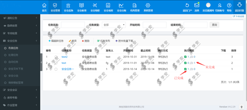 編輯內容保存后,安全任務處于“草稿”狀態,選中任務,點擊【任務發布】進入發布頁面。待任務確認無誤后,選擇要發布的任務,點擊“任務發布”后即可成功發布任務,任務發布成功,在列表中可以看到任務的執行情況;