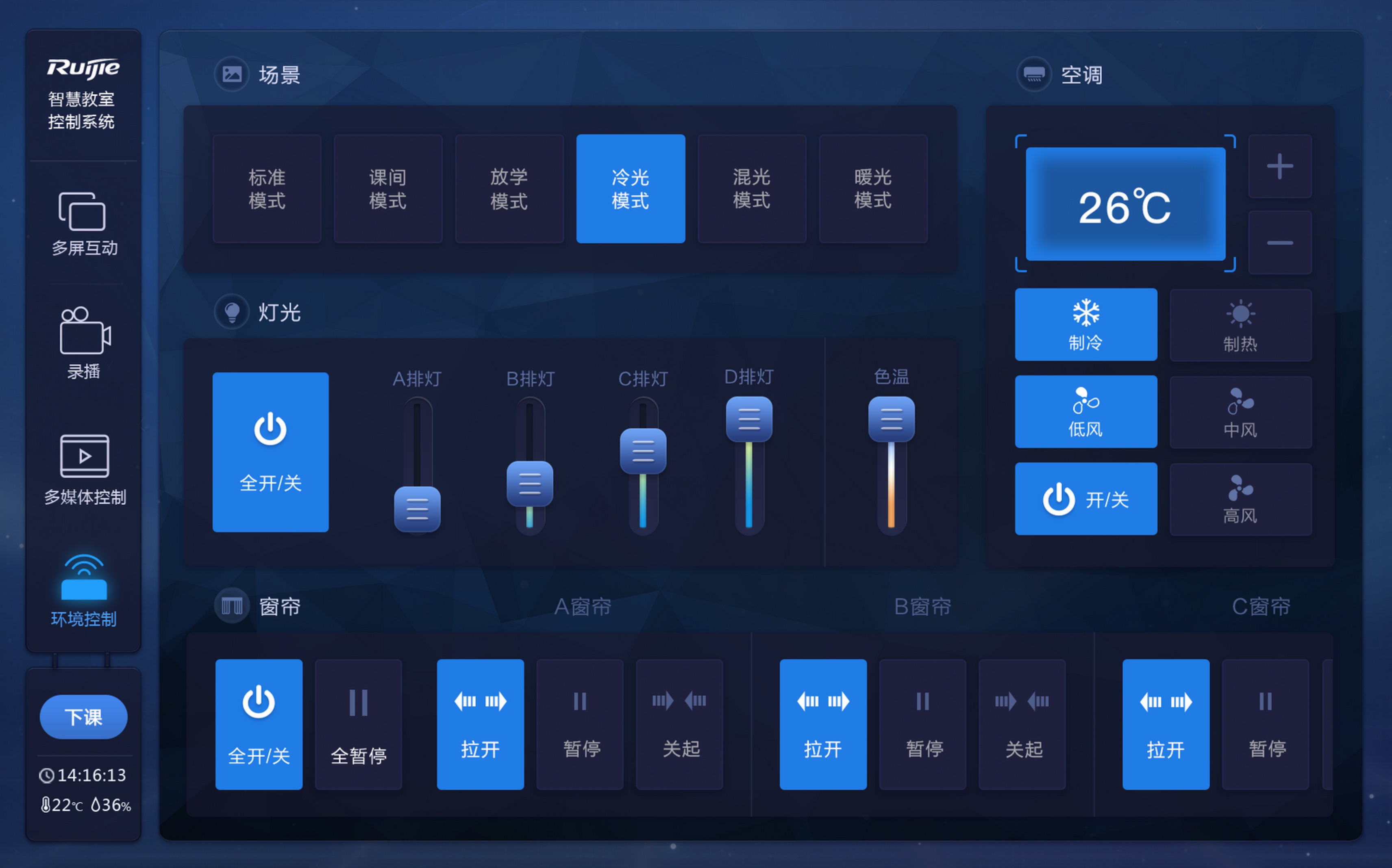 對學校而言:確保了教室環境滿足國家相關標準,綜合節能70%以上,集中管控,降低維護、維修成本,提高老師教學效率與效果。