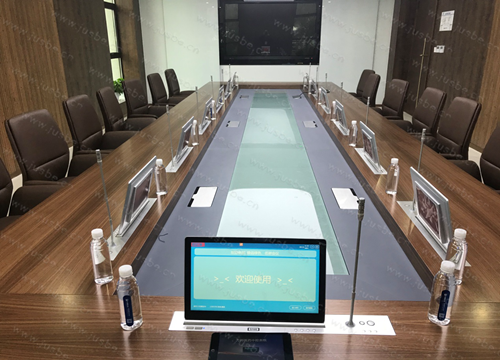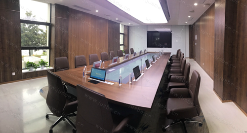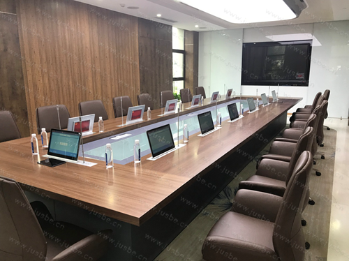 根據會議室布局及相關設計標準,萬邦醫藥無紙化系統中會議桌面采用嵌入式一體化雙顯升降終端,集成數字會議討論話筒升降一體。會議中一鍵手動、自動控制上升;會議后下降隱藏,不占桌面,整潔美觀。