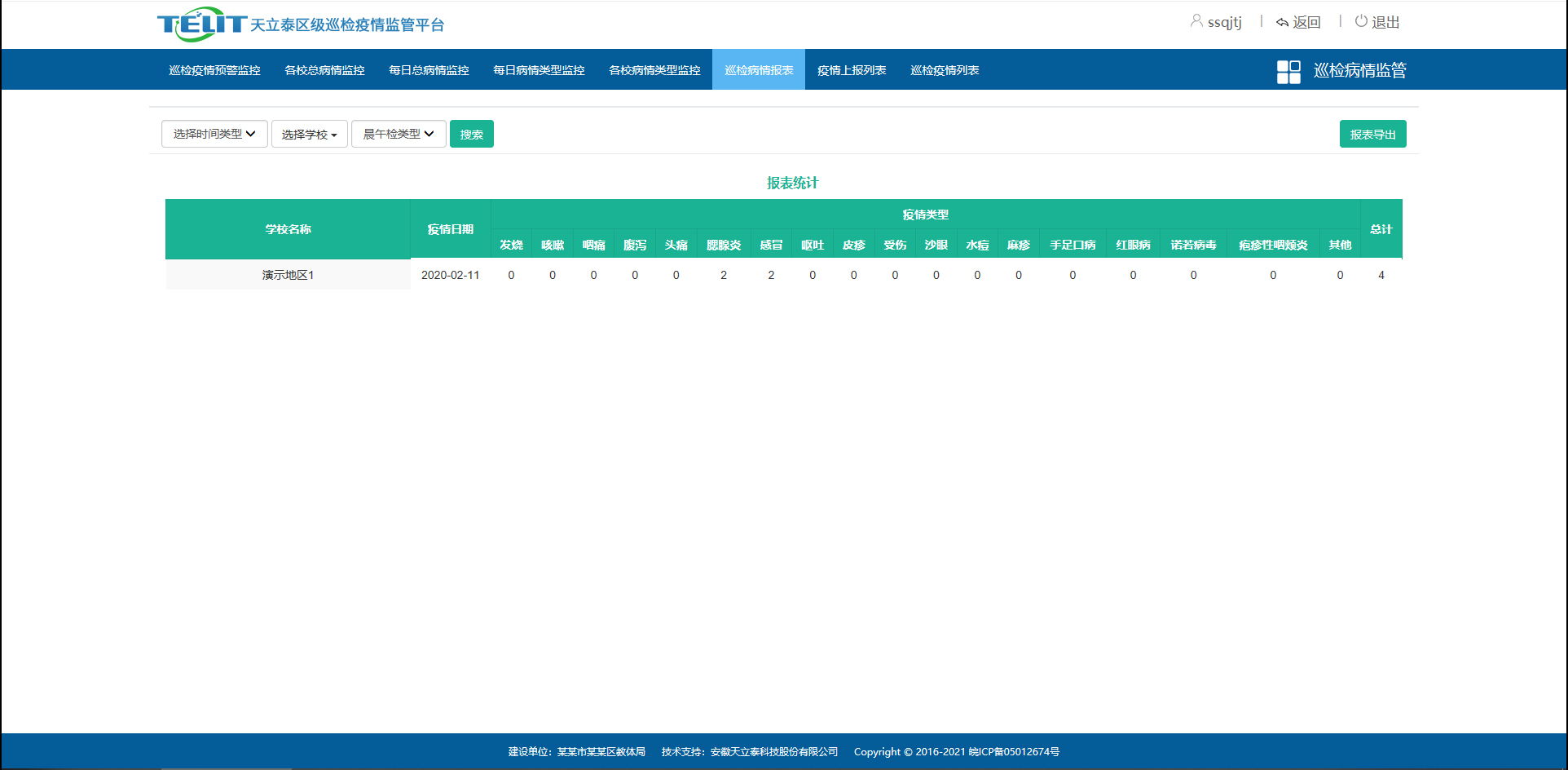 根據(jù)時(shí)間段、學(xué)校、晨午檢類型來查詢?cè)摃r(shí)間段內(nèi)的病情報(bào)表,點(diǎn)擊報(bào)表導(dǎo)出會(huì)下載該時(shí)間段內(nèi)的病情信息,不需要管理者核對(duì)數(shù)據(jù)表格進(jìn)行整理統(tǒng)計(jì),一鍵生成,減輕管理者工作負(fù)擔(dān)。