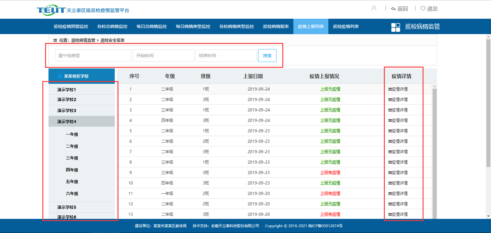 對(duì)各個(gè)時(shí)間段的各個(gè)學(xué)校疫情進(jìn)行監(jiān)控,支持對(duì)各個(gè)學(xué)校的年級(jí)和班級(jí)進(jìn)行查詢,并查看疫情詳情。及時(shí)的了解,才能更早地進(jìn)行防御規(guī)劃,避免重大疫情的發(fā)生與傳播。