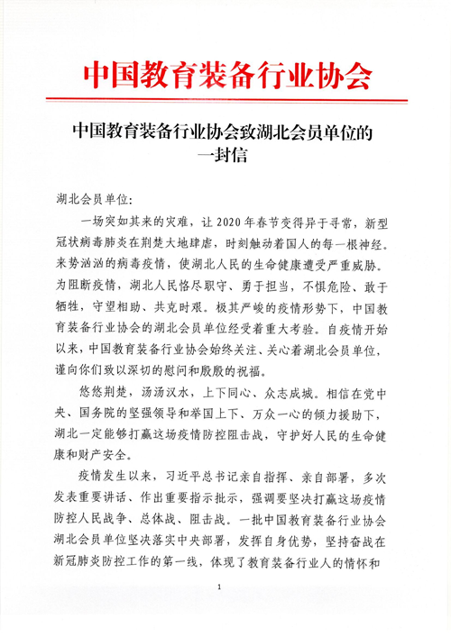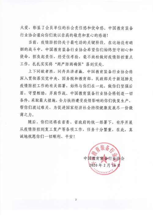 上下同欲者勝,同舟共濟者贏。中國教育裝備行業協會將深入貫徹落實黨中央、國務院和教育部、民政部關于新冠肺炎疫情防控工作的有關部署,始終與你們在一起,做你們堅強后盾,守望相助,并肩作戰。中國教育裝備行業協會將創造一切條件,采取最大措施,全力扶持遭受疫情影響的你們恢復生產,幫你們渡過難關,為促進國家經濟社會持續健康發展盡一份微薄之力。