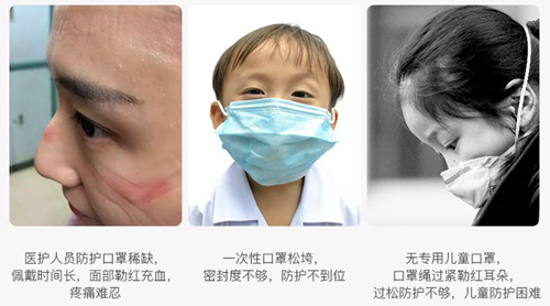 沖鋒在一線的醫(yī)務(wù)工作者、警務(wù)人員、志愿者等在與時間賽跑、疫情抗爭同時,他們需要長時間佩戴口罩。由于鼻梁顴骨和耳部等部位皮膚真皮層較薄,而且每個人的腦袋大小不一,長時間佩戴口罩不僅在臉上和耳后產(chǎn)生了深深的勒痕,充血,甚至出現(xiàn)傷口。