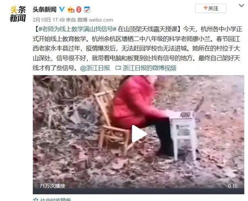 直播設備解決了,網絡又成了問題。在偏遠地區網絡信號不好,老師每天直播上課的時候,只能帶著電腦和板凳到處找信號,最終自己架好天線才有了些信號。