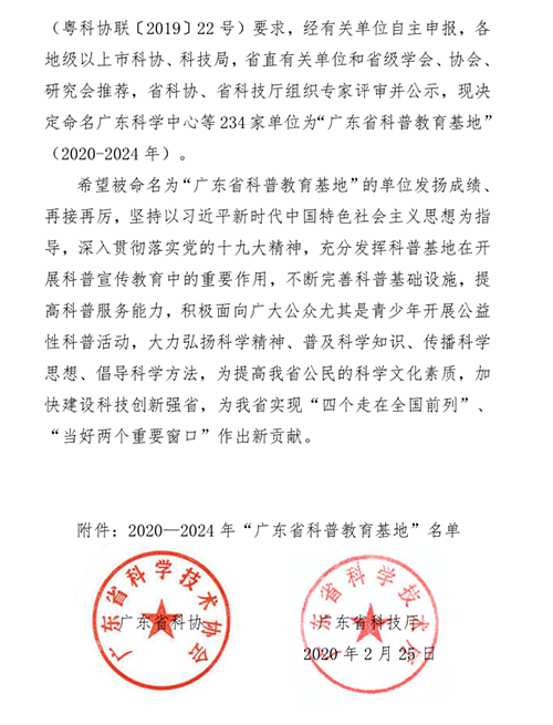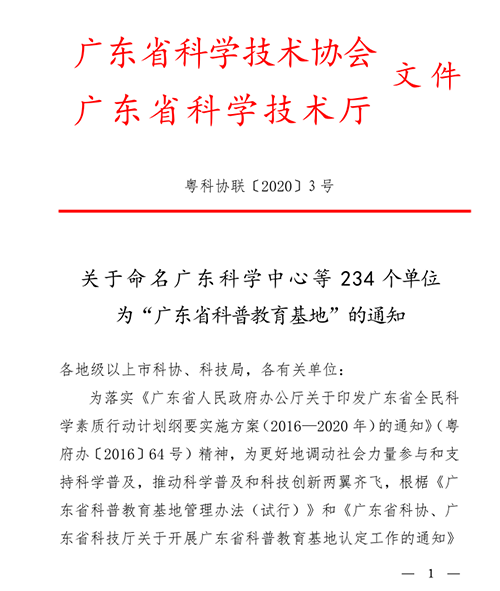 近日,廣東省科協、廣東省科技廳發布了《關于命名廣東科學中心等234個單位為“廣東省科普教育基地”的通知》,廣東廣視通科教設備有限公司被認定為廣東省科普教育基地。