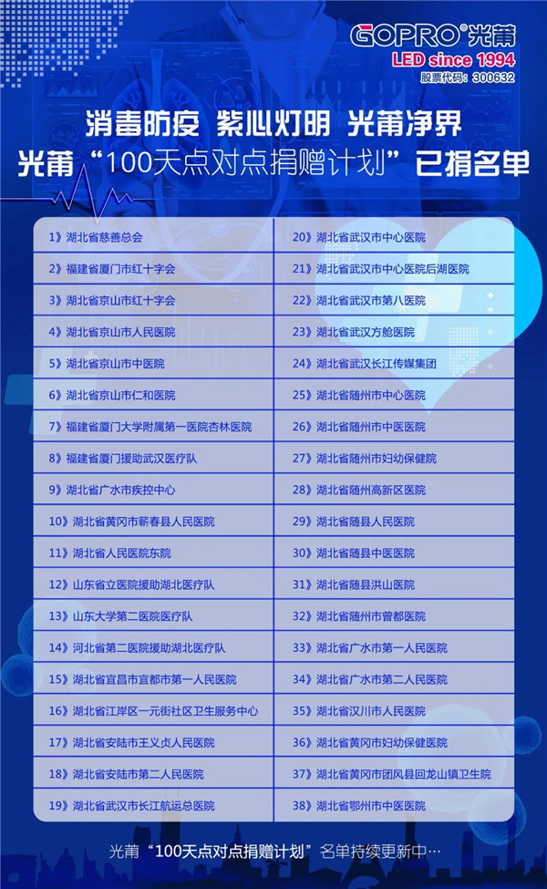 光莆股份“100天點對點捐贈計劃”實施以來,積極對接疫區防疫指揮部和醫院收集信息,確保愛心援助物資第一時間到達疫區一線。目前,光莆紫外系列殺菌消毒產品已在湖北及福建疫情防治定點醫院、疫情隔離觀察酒店等多處投入使用,為“最美逆行者”保駕護航。